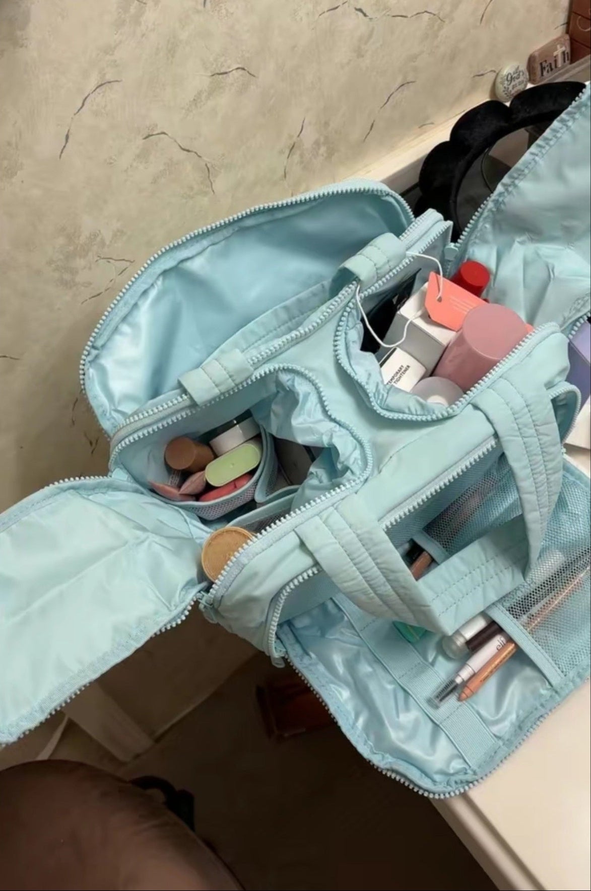 Mam sporo kosmetyków i nawet suszarka się zmieściła. Torba trzyma formę, nie przewraca się i nic się nie gniecie. Nawet jak coś się wyleje to materiał łatwo się czyści.