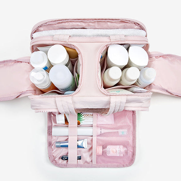 Specjalne gumki utrzymują pędzle, szczoteczki i drobiazgi dokładnie tam, gdzie powinny być. Przegrody i wodoodporne materiały dbają o porządek. Rzeczy mokre i suche nigdy się nie mieszają.